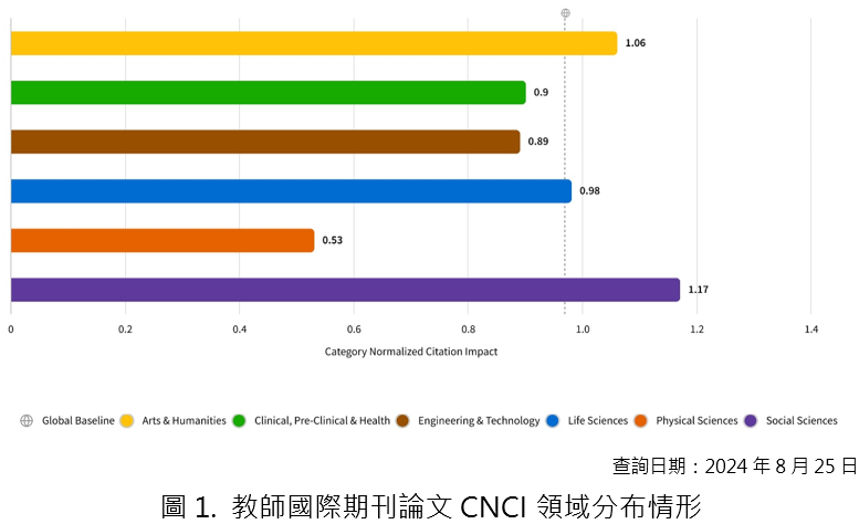 - 根據InCites 分析本校2010-2024年學科正規化引文影響力(Category Normalize Citation Impact,CNCI),三項領域之CNCI高於全球平均值0.97:「Art & Humanities」(1.06)、「Life Sciences」(0.98)及「Social Science」(1.17),接近全球平均值(差距不到0.1)之領域也有兩項:「Clinical,Pre-Clinical & Health」(0.9)、「Engineering & Technology」(0.89),本校教師的論文品質佳,在多個領域超越全球平均水準,顯示本校在這些應用與實作導向領域亦具有厚實的基礎與潛力。(圖1)