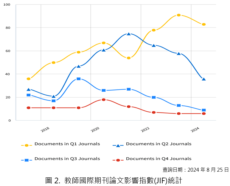 - 本校教師發表於SSCI、SCI及AHCI等國際期刊之當年影響指數(JIF)以該領域Q1及Q2最多,相較於2017年,2024年Q1成長131%、Q2成長33%,可見本校教師期刊論文品質近年來持續躍升,質性表現亮眼,顯示本校整體學術研究實力與影響力日益精進。(圖2)