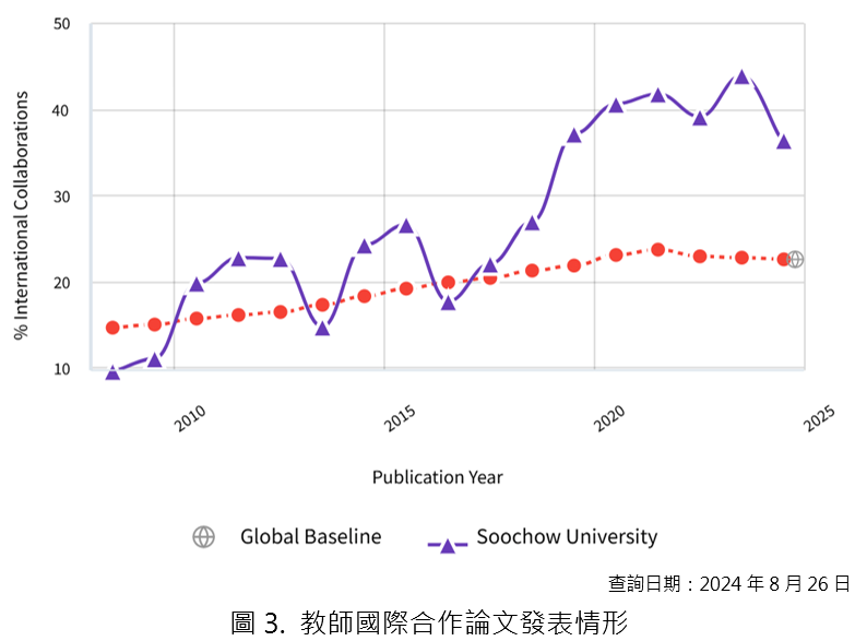 - 本校在國際學術合作方面取得了令人矚目的成長與成果,充分展現本校積極推動國際化、深化學術交流的努力與成果,繼2011年(22.94%)、2015年(26.49%)、2020年(41.95%)及2023年(44.07%)達到四次高峰,第四次高峰較第一次高峰成長92.11%;2024年本校國際合作論文佔整體論文發表總篇數33.55%,遠超過全球平均值(22.74%),此表現不僅提升本校在國際間的學術聲譽,也為師生帶來更多與世界接軌的機會,堪稱是持續深化國際連結、擴大科研能量的正向典範,值得肯定與讚賞。(圖3)